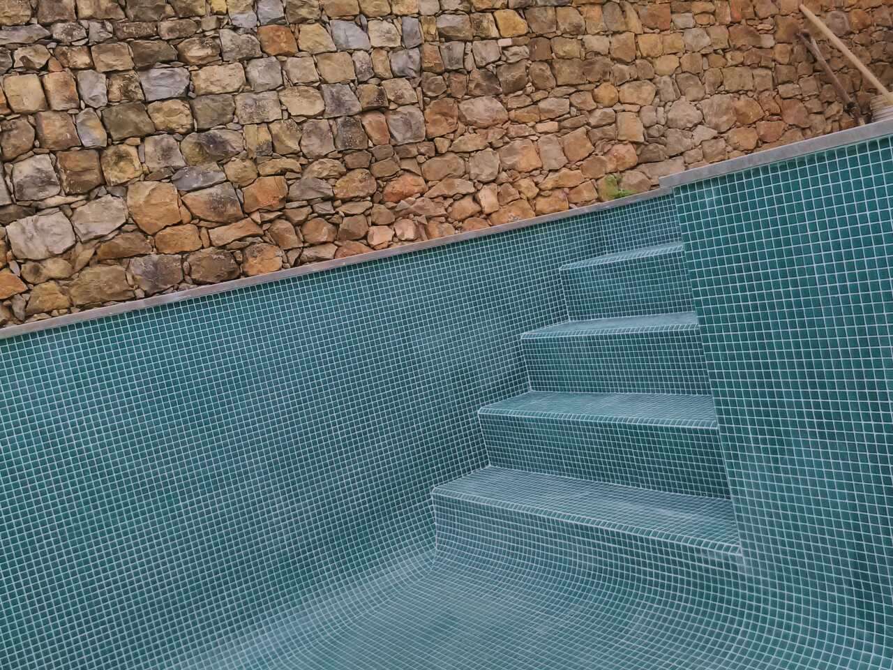 Fugas nas tubagens ou no revestimento. Aplicação de mosaico de vidro e tela armada.